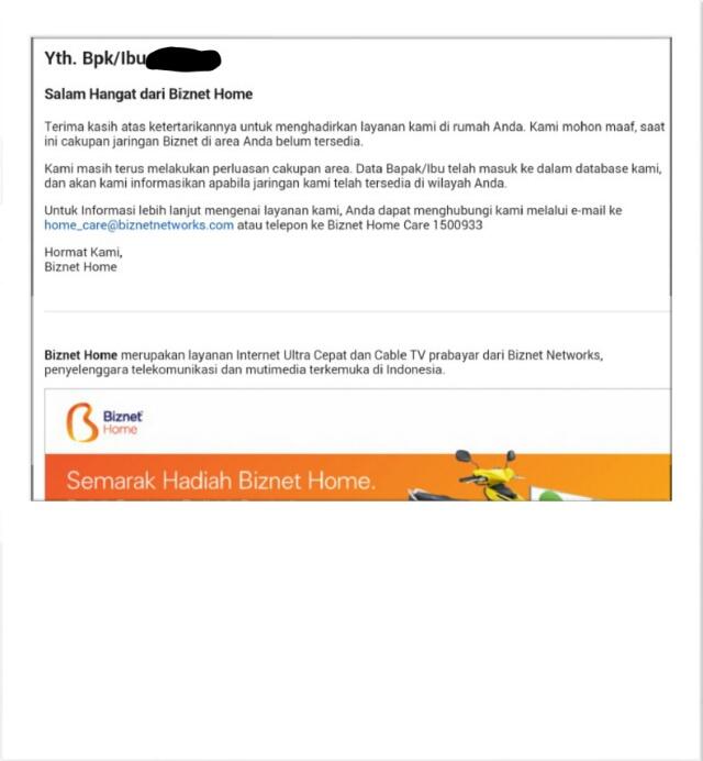 Biznet Home Area Kamu Belum Tercakup Dengan Layanan Facebook Biznet Home Care Telepon Image Source @ id-id.facebook.com